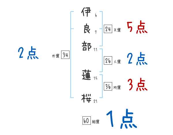 天運![]() | 伊良部蓮桜さんの天運は24画の5つ星!家庭運が良く順調な人生。金運にも恵まれる。 家系が持つ宿命的な運勢を表します。祖先から受け継いだ苗字ですので自分の力が及びません。家柄を象徴します。 |