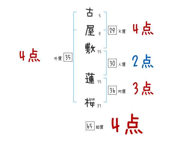 天運![]() | 古屋敷蓮桜さんの天運は29画の4つ星!完全主義で才能がある。厳格な心の持ち主。 家系が持つ宿命的な運勢を表します。祖先から受け継いだ苗字ですので自分の力が及びません。家柄を象徴します。 |