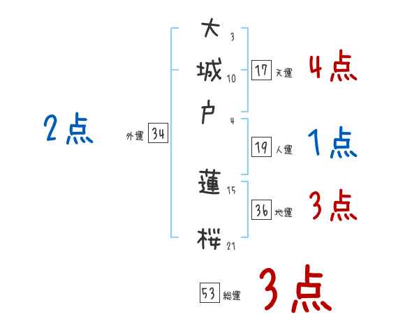 総運![]() | 大城戸蓮桜さんの総運は53画の3つ星!やや見栄っ張りで虚栄心がある。散財に注意。 あなたの人生を表す1番重要な運勢です。生涯を通じて影響する総合運となり、主に50歳以降の晩年期に影響を及ぼします。 |