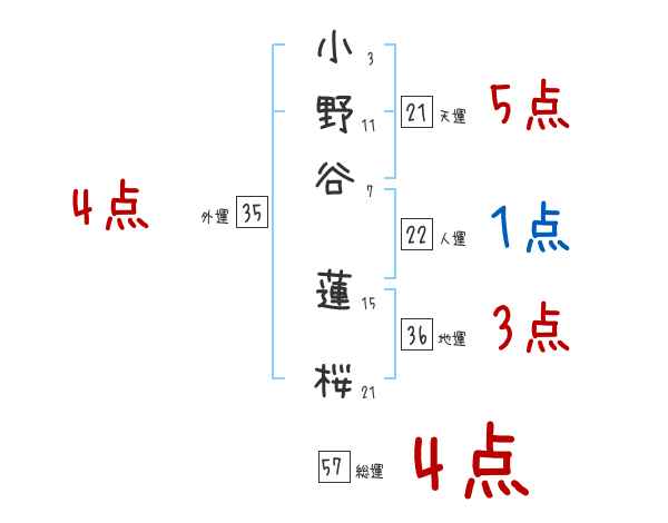 外運![]() | 小野谷蓮桜さんの外運は35画の4つ星!温厚な性格で感受性が高い。穏和な性格で人望が厚い。 生活面を象徴する運勢です。外部から受ける影響力を表し、結婚運、家庭運や職場、環境への順応性を表します。 |