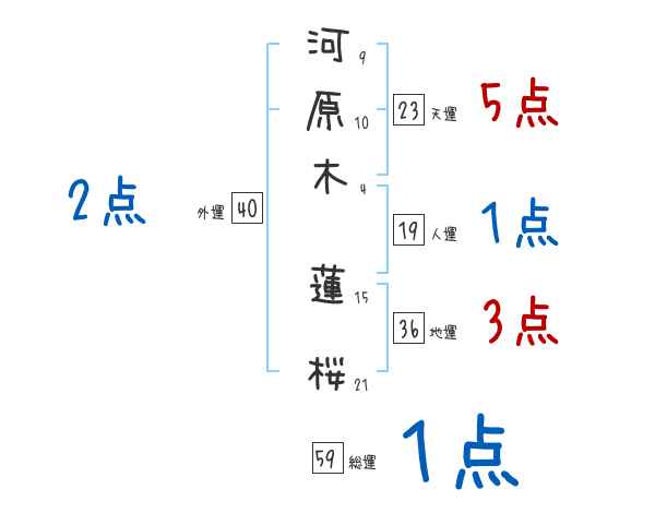 天運![]() | 河原木蓮桜さんの天運は23画の5つ星!想像力に優れ活力がある。一代で成功し名誉を手に入れる。 家系が持つ宿命的な運勢を表します。祖先から受け継いだ苗字ですので自分の力が及びません。家柄を象徴します。 |
