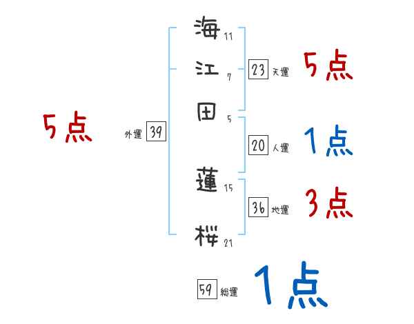 外運![]() | 海江田蓮桜さんの外運は39画の5つ星!社交性に優れ人望が厚い。人の上に立ち成功する。 生活面を象徴する運勢です。外部から受ける影響力を表し、結婚運、家庭運や職場、環境への順応性を表します。 |