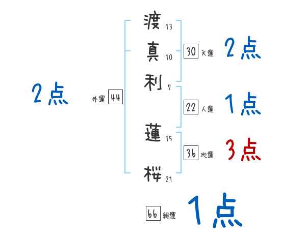 天運![]() | 渡真利蓮桜さんの天運は30画の2つ星!浮き沈みの激しさに注意しましょう。 家系が持つ宿命的な運勢を表します。祖先から受け継いだ苗字ですので自分の力が及びません。家柄を象徴します。 |