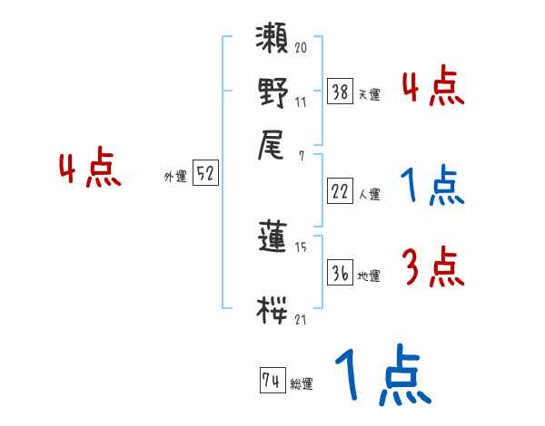 総運![]() | 瀬野尾蓮桜さんの総運は74画の1つ星!無気力で怠惰な生活送りがち。規則正しい生活を送るよう気をつけましょう。 あなたの人生を表す1番重要な運勢です。生涯を通じて影響する総合運となり、主に50歳以降の晩年期に影響を及ぼします。 |