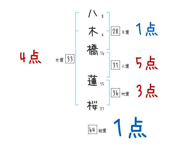 | 人運  | 八木橋蓮桜さんの人運は31画の5つ星!社交性があり判断力に優れる。順風満帆な人生で円満な生活。性格や才能などを表す2番目に重要な運勢です。人間関係や協調性、社会的な成功に影響します。主に20歳から50歳ぐらいまでの中年期の運勢を表します。 |