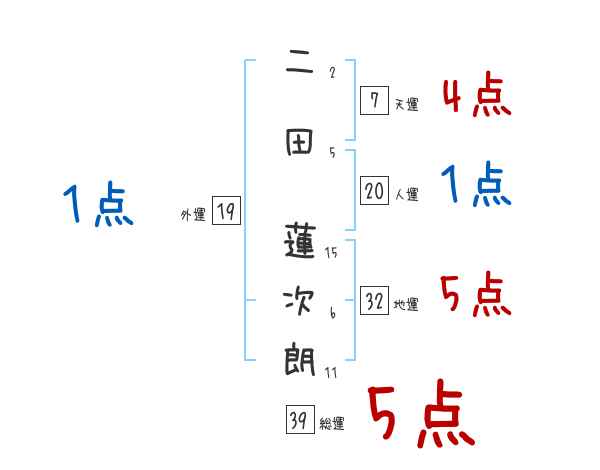 天運![]() | 二田蓮次朗さんの天運は7画の4つ星!強い意志や信念を持ち独立心が強い。自立する。 家系が持つ宿命的な運勢を表します。祖先から受け継いだ苗字ですので自分の力が及びません。家柄を象徴します。 |