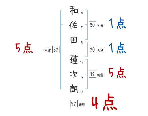 外運![]() | 和佐田蓮次朗さんの外運は32画の5つ星!柔軟性があり成功する。チャンスが多く金運が良い。 生活面を象徴する運勢です。外部から受ける影響力を表し、結婚運、家庭運や職場、環境への順応性を表します。 |