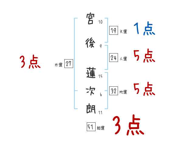 天運![]() | 宮後蓮次朗さんの天運は19画の1つ星!優れた才能を持ちますが、協調性が足りないことも。周りの人と協力する事を意識しましょう。 家系が持つ宿命的な運勢を表します。祖先から受け継いだ苗字ですので自分の力が及びません。家柄を象徴します。 |
