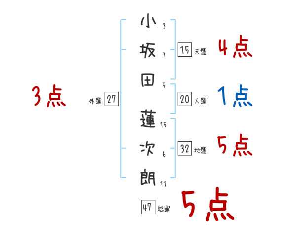 総運![]() | 小坂田蓮次朗さんの総運は47画の5つ星!実力が開花し発展する円満な人生。財に恵まれる。 あなたの人生を表す1番重要な運勢です。生涯を通じて影響する総合運となり、主に50歳以降の晩年期に影響を及ぼします。 |