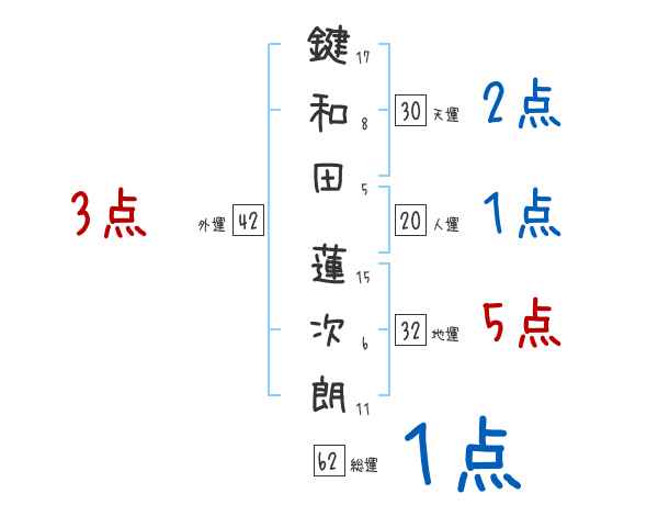 地運![]() | 鍵和田蓮次朗さんの地運は32画の5つ星!柔軟性があり成功する。チャンスが多く金運が良い。 個性を表す基礎的な運勢です。性格形成や対人関係、行動力など家庭環境に影響されます。主に誕生してから20歳くらいまでの若年期の運勢を表します。 |