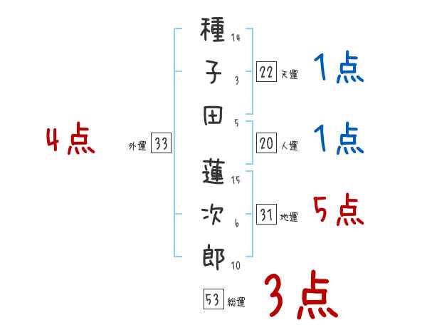 外運![]() | 種子田蓮次郎さんの外運は33画の4つ星!権力志向でプライドが高い。勇気があり運を切り開き成功する。 生活面を象徴する運勢です。外部から受ける影響力を表し、結婚運、家庭運や職場、環境への順応性を表します。 |