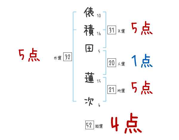 外運![]() | 俵積田蓮次さんの外運は32画の5つ星!柔軟性があり成功する。チャンスが多く金運が良い。 生活面を象徴する運勢です。外部から受ける影響力を表し、結婚運、家庭運や職場、環境への順応性を表します。 |