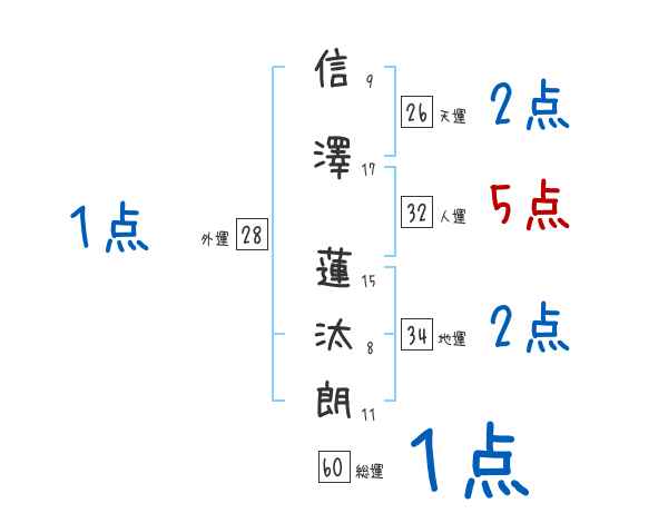 人運![]() | 信澤蓮汰朗さんの人運は32画の5つ星!柔軟性があり成功する。チャンスが多く金運が良い。 性格や才能などを表す2番目に重要な運勢です。人間関係や協調性、社会的な成功に影響します。主に20歳から50歳ぐらいまでの中年期の運勢を表します。 |