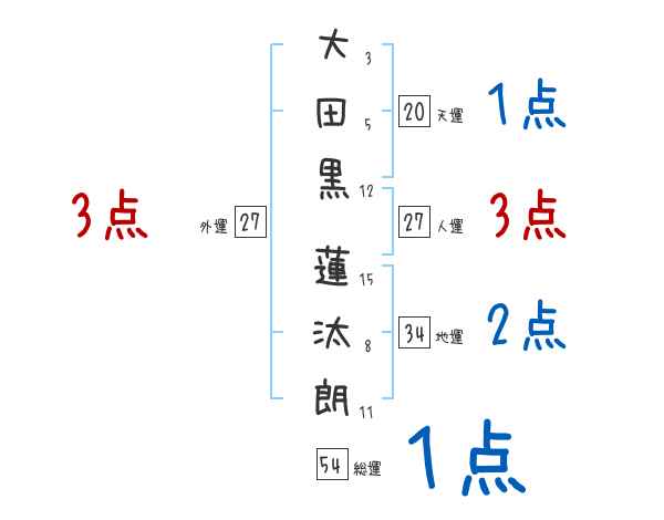 総運![]() | 大田黒蓮汰朗さんの総運は54画の1つ星!トラブルが多いかも。周りをよく見て協調して過ごしましょう。 あなたの人生を表す1番重要な運勢です。生涯を通じて影響する総合運となり、主に50歳以降の晩年期に影響を及ぼします。 |
