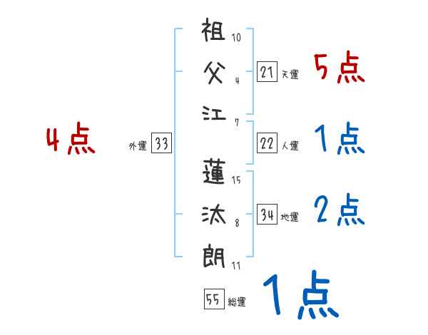 外運![]() | 祖父江蓮汰朗さんの外運は33画の4つ星!権力志向でプライドが高い。勇気があり運を切り開き成功する。 生活面を象徴する運勢です。外部から受ける影響力を表し、結婚運、家庭運や職場、環境への順応性を表します。 |