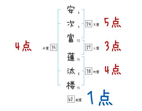 天運![]() | 安次富蓮汰楼さんの天運は24画の5つ星!家庭運が良く順調な人生。金運にも恵まれる。 家系が持つ宿命的な運勢を表します。祖先から受け継いだ苗字ですので自分の力が及びません。家柄を象徴します。 |