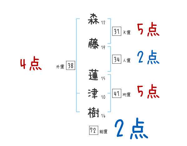 総運![]() | 森藤蓮津樹さんの総運は72画の2つ星!災難が多く不安定な生活にならないように注意。明暗のある人生かも。 あなたの人生を表す1番重要な運勢です。生涯を通じて影響する総合運となり、主に50歳以降の晩年期に影響を及ぼします。 |