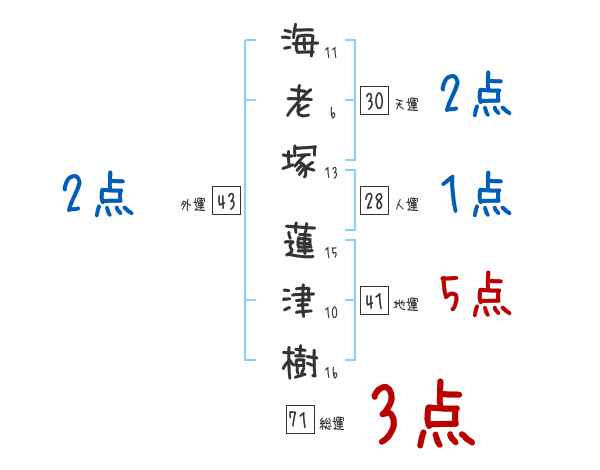 総運![]() | 海老塚蓮津樹さんの総運は71画の3つ星!力が弱く小心者だが、いずれ安泰を手に入れる。 あなたの人生を表す1番重要な運勢です。生涯を通じて影響する総合運となり、主に50歳以降の晩年期に影響を及ぼします。 |