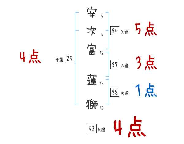 天運![]() | 安次富蓮獅さんの天運は24画の5つ星!家庭運が良く順調な人生。金運にも恵まれる。 家系が持つ宿命的な運勢を表します。祖先から受け継いだ苗字ですので自分の力が及びません。家柄を象徴します。 |