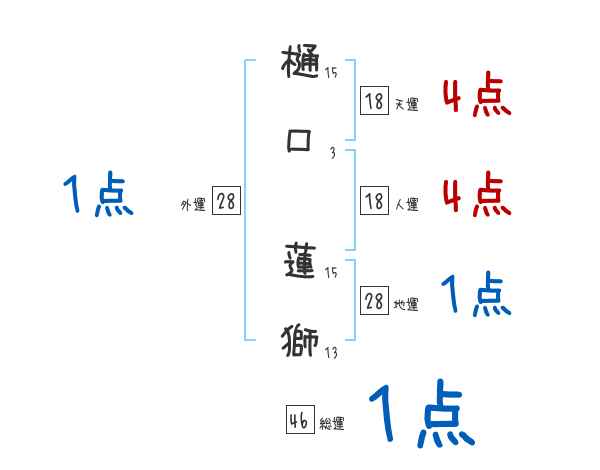 総運![]() | 樋口蓮獅さんの総運は46画の1つ星!迷走することが多く苦労するかも。目先のことにとらわれないように。 あなたの人生を表す1番重要な運勢です。生涯を通じて影響する総合運となり、主に50歳以降の晩年期に影響を及ぼします。 |