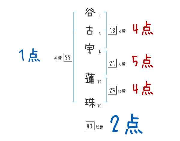 天運![]() | 谷古宇蓮珠さんの天運は18画の4つ星!情熱的で剛気。忍耐力があり信頼される。 家系が持つ宿命的な運勢を表します。祖先から受け継いだ苗字ですので自分の力が及びません。家柄を象徴します。 |