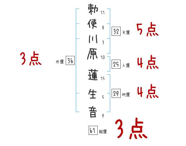 天運![]() | 勅使川原蓮生音さんの天運は32画の5つ星!柔軟性があり成功する。チャンスが多く金運が良い。 家系が持つ宿命的な運勢を表します。祖先から受け継いだ苗字ですので自分の力が及びません。家柄を象徴します。 |