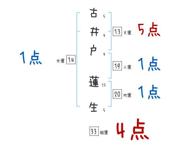 天運![]() | 古井戸蓮生さんの天運は13画の5つ星!才能に恵まれ人気がある。名声を手に入れる。円満な人生。 家系が持つ宿命的な運勢を表します。祖先から受け継いだ苗字ですので自分の力が及びません。家柄を象徴します。 |