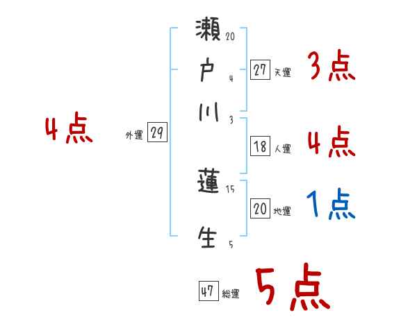 総運![]() | 瀬戸川蓮生さんの総運は47画の5つ星!実力が開花し発展する円満な人生。財に恵まれる。 あなたの人生を表す1番重要な運勢です。生涯を通じて影響する総合運となり、主に50歳以降の晩年期に影響を及ぼします。 |