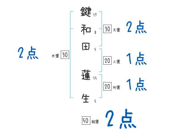 天運![]() | 鍵和田蓮生さんの天運は30画の2つ星!浮き沈みの激しさに注意しましょう。 家系が持つ宿命的な運勢を表します。祖先から受け継いだ苗字ですので自分の力が及びません。家柄を象徴します。 |