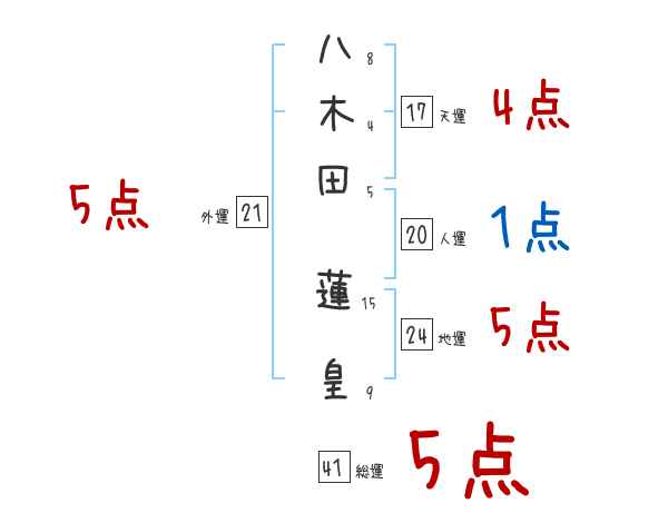 外運![]() | 八木田蓮皇さんの外運は21画の5つ星!統率力がある。独立し成功する。名誉を手に入れる。 生活面を象徴する運勢です。外部から受ける影響力を表し、結婚運、家庭運や職場、環境への順応性を表します。 |