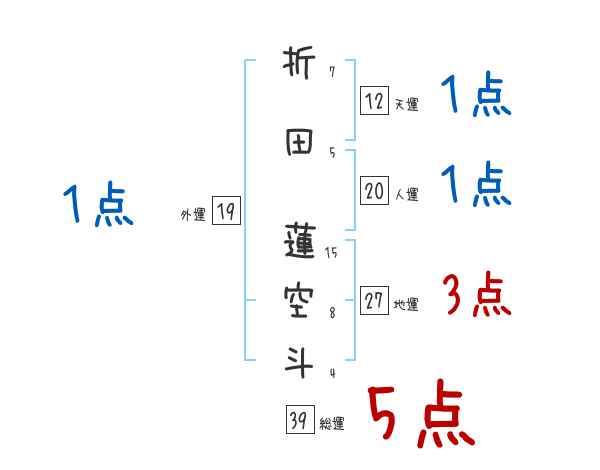 総運![]() | 折田蓮空斗さんの総運は39画の5つ星!社交性に優れ人望が厚い。人の上に立ち成功する。 あなたの人生を表す1番重要な運勢です。生涯を通じて影響する総合運となり、主に50歳以降の晩年期に影響を及ぼします。 |