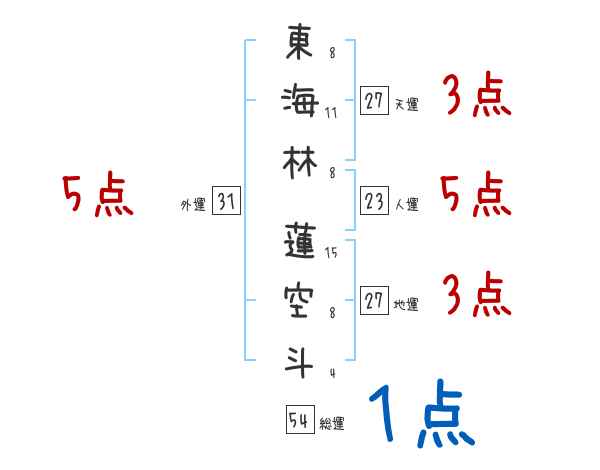 人運![]() | 東海林蓮空斗さんの人運は23画の5つ星!想像力に優れ活力がある。一代で成功し名誉を手に入れる。 性格や才能などを表す2番目に重要な運勢です。人間関係や協調性、社会的な成功に影響します。主に20歳から50歳ぐらいまでの中年期の運勢を表します。 |