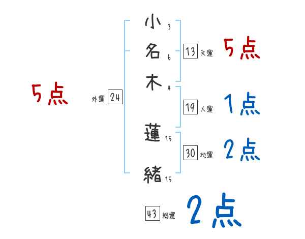 外運![]() | 小名木蓮緒さんの外運は24画の5つ星!家庭運が良く順調な人生。金運にも恵まれる。 生活面を象徴する運勢です。外部から受ける影響力を表し、結婚運、家庭運や職場、環境への順応性を表します。 |
