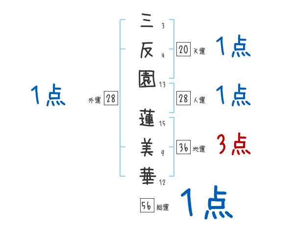 地運![]() | 三反園蓮美華さんの地運は36画の3つ星!先見性が豊かです。多少神経質で苦労することも。 個性を表す基礎的な運勢です。性格形成や対人関係、行動力など家庭環境に影響されます。主に誕生してから20歳くらいまでの若年期の運勢を表します。 |
