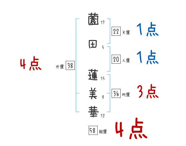 総運![]() | 薗田蓮美華さんの総運は58画の4つ星!安定した生活。大器晩成タイプ。 あなたの人生を表す1番重要な運勢です。生涯を通じて影響する総合運となり、主に50歳以降の晩年期に影響を及ぼします。 |