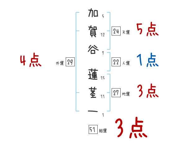 人運![]() | 加賀谷蓮茎一さんの人運は22画の1つ星!努力することが苦手ないっぽう手先が器用。芸術性にも優れる。 性格や才能などを表す2番目に重要な運勢です。人間関係や協調性、社会的な成功に影響します。主に20歳から50歳ぐらいまでの中年期の運勢を表します。 |