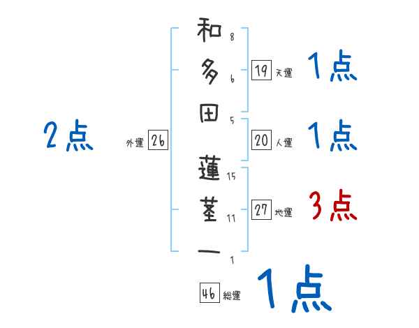外運![]() | 和多田蓮茎一さんの外運は26画の2つ星!波瀾万丈かも。信頼できる人を大事にしましょう。 生活面を象徴する運勢です。外部から受ける影響力を表し、結婚運、家庭運や職場、環境への順応性を表します。 |
