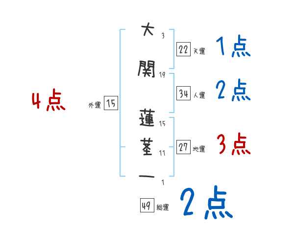 天運![]() | 大関蓮茎一さんの天運は22画の1つ星!努力することが苦手ないっぽう手先が器用。芸術性にも優れる。 家系が持つ宿命的な運勢を表します。祖先から受け継いだ苗字ですので自分の力が及びません。家柄を象徴します。 |