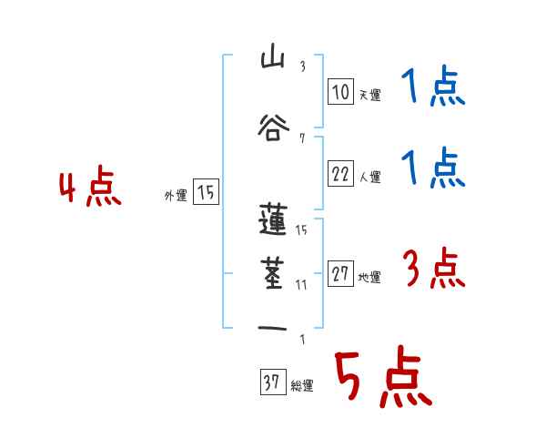 外運![]() | 山谷蓮茎一さんの外運は15画の4つ星!人徳があり出世する。順調に物事を進め円満な人生。 生活面を象徴する運勢です。外部から受ける影響力を表し、結婚運、家庭運や職場、環境への順応性を表します。 |