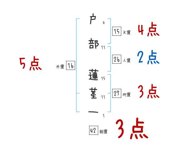 天運![]() | 戸部蓮茎一さんの天運は15画の4つ星!人徳があり出世する。順調に物事を進め円満な人生。 家系が持つ宿命的な運勢を表します。祖先から受け継いだ苗字ですので自分の力が及びません。家柄を象徴します。 |