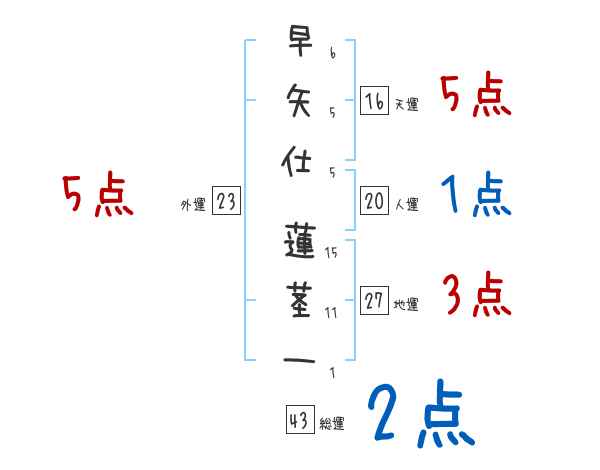 外運![]() | 早矢仕蓮茎一さんの外運は23画の5つ星!想像力に優れ活力がある。一代で成功し名誉を手に入れる。 生活面を象徴する運勢です。外部から受ける影響力を表し、結婚運、家庭運や職場、環境への順応性を表します。 |