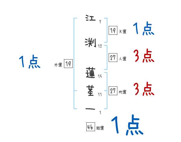 天運![]() | 江渕蓮茎一さんの天運は19画の1つ星!優れた才能を持ちますが、協調性が足りないことも。周りの人と協力する事を意識しましょう。 家系が持つ宿命的な運勢を表します。祖先から受け継いだ苗字ですので自分の力が及びません。家柄を象徴します。 |