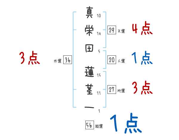 外運![]() | 真栄田蓮茎一さんの外運は36画の3つ星!先見性が豊かです。多少神経質で苦労することも。 生活面を象徴する運勢です。外部から受ける影響力を表し、結婚運、家庭運や職場、環境への順応性を表します。 |