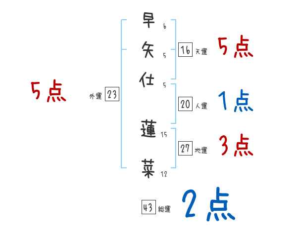 天運![]() | 早矢仕蓮菜さんの天運は16画の5つ星!人望が厚く大きく発展する。逆転成功が見える。 家系が持つ宿命的な運勢を表します。祖先から受け継いだ苗字ですので自分の力が及びません。家柄を象徴します。 |