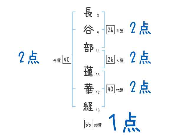 天運![]() | 長谷部蓮華経さんの天運は26画の2つ星!波瀾万丈かも。信頼できる人を大事にしましょう。 家系が持つ宿命的な運勢を表します。祖先から受け継いだ苗字ですので自分の力が及びません。家柄を象徴します。 |