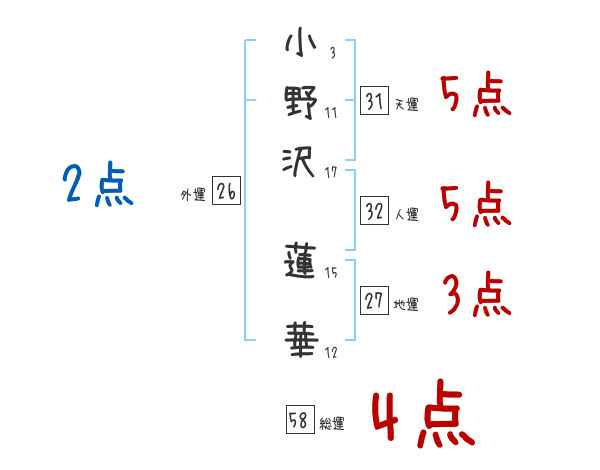 人運![]() | 小野沢蓮華さんの人運は32画の5つ星!柔軟性があり成功する。チャンスが多く金運が良い。 性格や才能などを表す2番目に重要な運勢です。人間関係や協調性、社会的な成功に影響します。主に20歳から50歳ぐらいまでの中年期の運勢を表します。 |