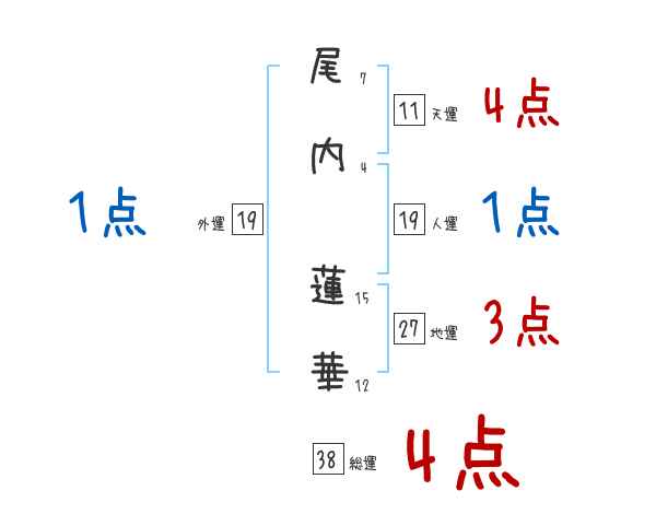 天運![]() | 尾内蓮華さんの天運は11画の4つ星!着実に富や地位を得る幸運な人生。 家系が持つ宿命的な運勢を表します。祖先から受け継いだ苗字ですので自分の力が及びません。家柄を象徴します。 |