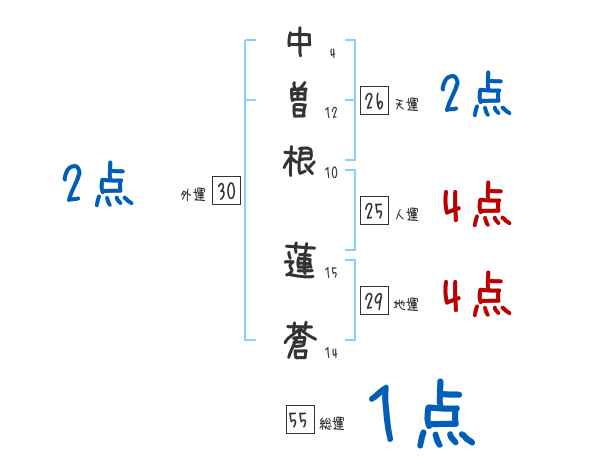 外運![]() | 中曽根蓮蒼さんの外運は30画の2つ星!浮き沈みの激しさに注意しましょう。 生活面を象徴する運勢です。外部から受ける影響力を表し、結婚運、家庭運や職場、環境への順応性を表します。 |