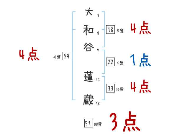 外運![]() | 大和谷蓮蔵さんの外運は29画の4つ星!完全主義で才能がある。厳格な心の持ち主。 生活面を象徴する運勢です。外部から受ける影響力を表し、結婚運、家庭運や職場、環境への順応性を表します。 |