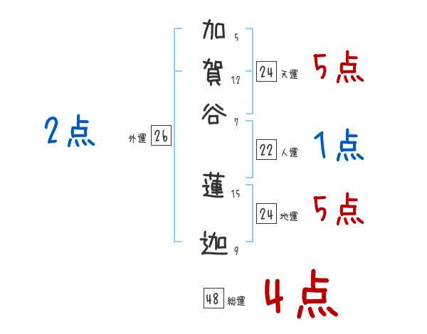 人運![]() | 加賀谷蓮迦さんの人運は22画の1つ星!努力することが苦手ないっぽう手先が器用。芸術性にも優れる。 性格や才能などを表す2番目に重要な運勢です。人間関係や協調性、社会的な成功に影響します。主に20歳から50歳ぐらいまでの中年期の運勢を表します。 |